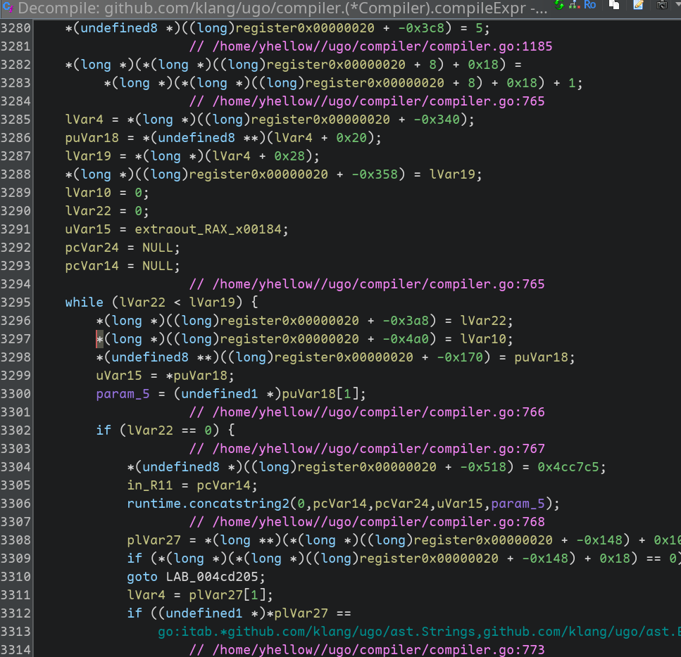 Ghidra的go插件能够恢复部分编译时的信息,包括源代码位置,因此可以清楚看到作者是 yhellow,还可以看到他的仓库里有Syclover的内容,肯定没错了。