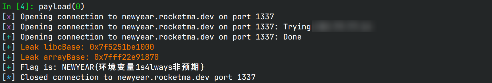 Flag放在环境变量里,但是要被覆写了😨 沙箱中除了read和write以外的系统调用,都只是为了让程序不似,不是用来利用的 libc是2.35-0ubuntu3.8_amd64 nc newyear.rocketma.dev 1337