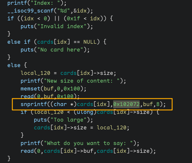 为了避免潜在的溢出,需做一个参数调换。将其修改为snprintf((char *)cards[idx],8,"%lu",buf)。