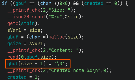 题目中就两个漏洞:部分写入导致的信息泄露,以及在执行create时对malloc结果不做检查,