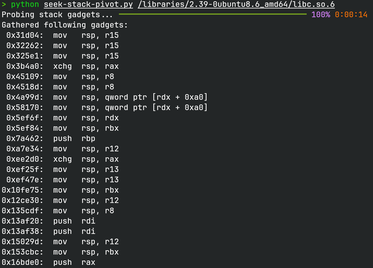 过往的setcontext gadget感觉如今用起来有些限制,所以我决定爆搜libc,看看有没有别的gadget。